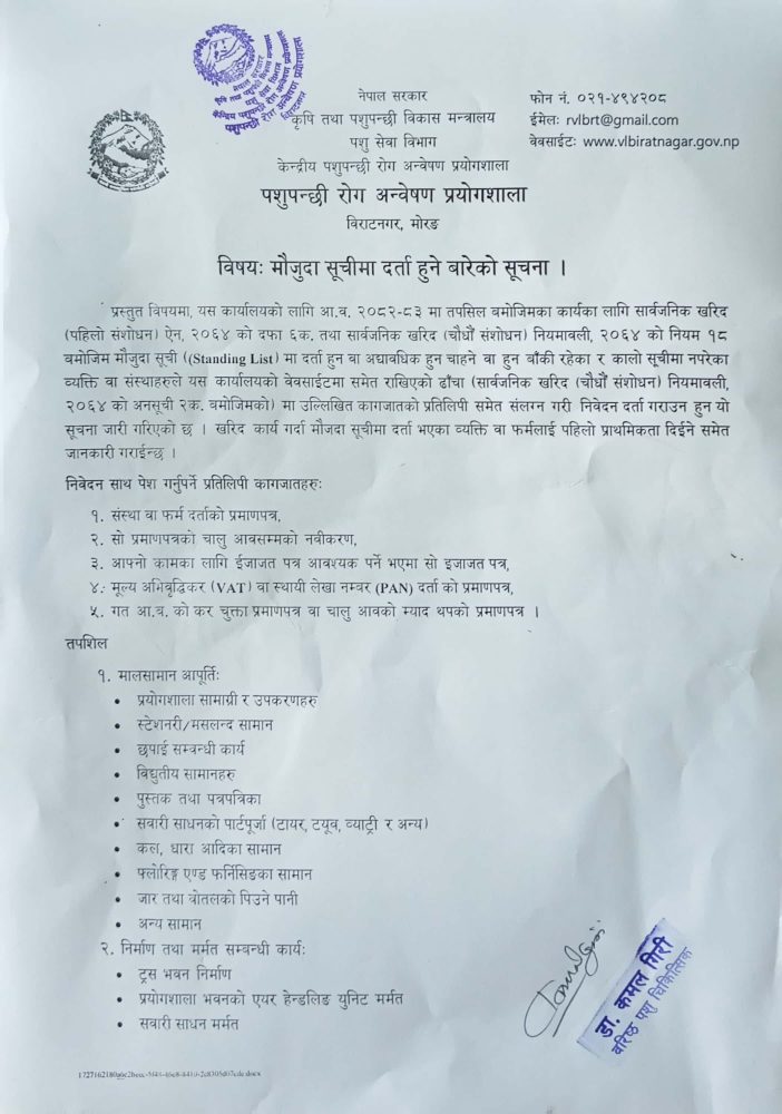 Veterinary Laboratory (VL) previous named Regional Veterinary Laboratory (RVL) has been situated in metropolitan city, Biratnagar-13, Province no.1, of eastern Nepal and was established in the fiscal year 1988/1989 AD. From FY 2048/2049, the laboratory had its separate identity as Regional Veterinary Laboratory (RVL) with specific roles, objectives, manpower, logistics and financial support. The scope of the area of the RVL were all the 16 districts of the-then administrative structure of Eastern Development Region.The scope of work area is all 14 districts of province 1. Additionally, the laboratory is still providing services to the 2 districts of Province-2 (namely Saptari and Siraha).